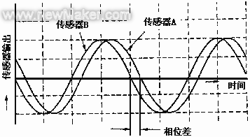 隨著振蕩運(yùn)動(dòng)的進(jìn)行,丈量管被周期性地分開(kāi)、靠攏,科氏力也周期性地作用在兩根丈量管上,通過(guò)安裝在丈量管上的位移創(chuàng)按其A、B,測(cè)出由科氏力引起的丈量管相對(duì)位置的變化,通常轉(zhuǎn)化為測(cè)兩點(diǎn)的相位差,如圖7所示。這個(gè)相位差的大小與質(zhì)量流量成正比。