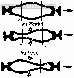 如圖23a,當(dāng)管子分開(kāi)時(shí),在振點(diǎn)前的流體中產(chǎn)生的科里奧利力與振動(dòng)力方向相反,減慢管子的運(yùn)動(dòng)速度;而在振點(diǎn)之后管中流體產(chǎn)生的科氏力與振動(dòng)方向相同,加快管子的運(yùn)動(dòng)速度。當(dāng)驅(qū)動(dòng)器使管子靠近時(shí),如圖23b,則產(chǎn)生相反的結(jié)果。在A、B兩點(diǎn)的傳感器可測(cè)的兩處管字運(yùn)動(dòng)的相位差,由此可得到流過(guò)測(cè)管中流體的質(zhì)量流量。