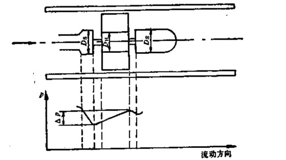 由于流體通過渦輪時(shí)會(huì)對(duì)渦輪產(chǎn)生一個(gè)軸向推力,使鈾承的摩擦轉(zhuǎn)矩增大,加速鈾承磨損,為了消除軸向力,需在結(jié)構(gòu)上采取水力平衡措施,這方法的原理見圖3-3所示。由于渦輪處直徑DH略小于前后支架處直徑Ds,所以,在渦輪段流通截而擴(kuò)大,流速降低,使流體靜壓上升 P,這個(gè) P的靜壓將起到抵消部分軸向推力的作用。