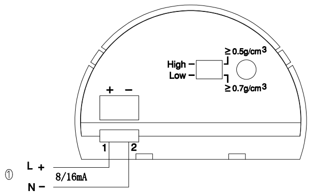 ①密度開關(guān) ② 高低位模式 ③ 指示燈 ④ 接線端子 ⑤ 接地端子