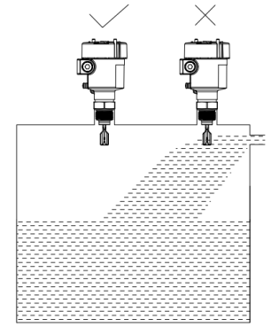 如圖2,選擇音叉液位開關(guān)的安裝位置時(shí),應(yīng)避免由于安裝在入料口位置而造成的測量誤差,甚至損壞儀表。