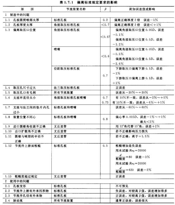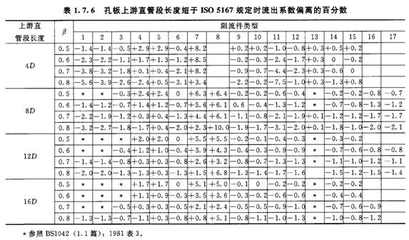 當節(jié)流件上游側(cè)直管段長度不符標準規(guī)定時,流出系數(shù)將發(fā)生變化。表1.7.6及表1.7.7列舉若干流出系數(shù)偏差的估算值及其附加不確定度。