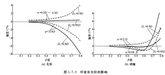 環(huán)室內(nèi)徑小于管道內(nèi)徑,如圖1.7.8所示,將產(chǎn)生大的測量誤差。圖1.7.9所示為環(huán)室產(chǎn)生臺階時流出系數(shù)的偏差影響。