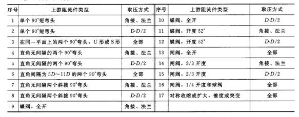 表1.7.5所示為節(jié)流件前后裝設異徑管。由表可見,在節(jié)流件前裝設漸擴管會引起很大的測量誤差,而在節(jié)流件前后裝設漸縮管,只要漸縮管夾角不大,流出系數(shù)的偏離可小于2%。