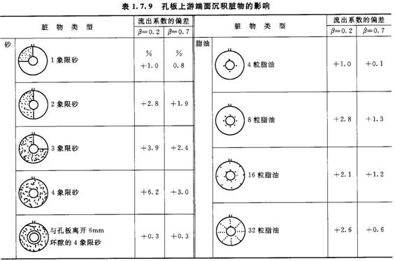 表1.7.9所示為孔板上游端面沉積臟物對流出系數(shù)的影響。砂粒顆粒尺寸為O.4mm,脂油污點的直徑為6.3mm,厚為2.5mm,孔板裝于DN100測量管內(nèi),測量大氣壓下的空氣。由圖可見,孔板入口處環(huán)狀區(qū)域的情況很重要,它對測量誤差的影響起主要作用。