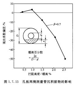 圖1.7.14和圖1.7.15所示為孔板上游側(cè)測量管底部沉積臟物對流出系數(shù)的影響。