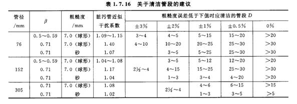 表1.7.16所示為管壁清除臟物(結(jié)垢),使粗糙度降低后改善流出系數(shù)測量誤差的情況。由表可見,在節(jié)流件上游側(cè)附近一段管道清除污物可以顯著提高流出系數(shù)的測量精度。對于大口徑管道(DN>300),清洗的管段可以顯著縮短。