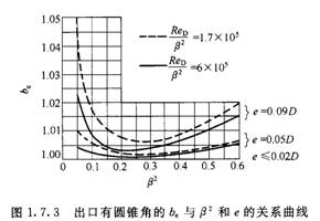 孔板開孔圓筒形部分長度e不論其出口是否有圃錐角,均應小于或等于0.02D.對角接取壓標準孔板,當e>0.02D時,應進行修正,其修正系數(shù)為be.be與ReD無關,僅與e和B2有關。但是,出口有圓錐角的孔板和無圓錐角的孔板,其be值是不同的,如圖1.7.2和圖1.7.3所示。這兩張圖可采用線性內(nèi)插,但不得外推。