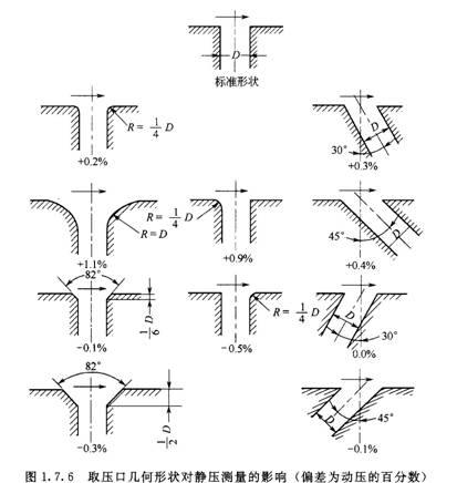取壓口有毛刺或沉積污物會引起誤差,特別在流速較高處,如噴嘴和文丘里管的喉部,將引起很大的誤差,角接取壓口在流動的滯止區(qū),因此影響稍小些。取壓口幾何形狀對靜壓測量的影響如圖1.7.6所示。其偏差為動壓的百分數(shù)。