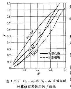 1.角接取壓標準孔板在糙管中流出系數(shù)的變化圖1.7.17和圖1.7.18所示為角接取壓標準孔板在糙管中流出系數(shù)的變化。圖1.7.17所示管壁條件為:管壁結(jié)垢為球形瘤,平均尺寸為6.3mm,亦就是管道內(nèi)徑有效值減少約6.3mm。 因中虛線B=0.71是經(jīng)砂磨表面,顆粒約O.5~1.Omm。圖1.7.18所示的管壁條件顆粒尺寸約1mm多,即約為圖1.7.17所示的1/3。