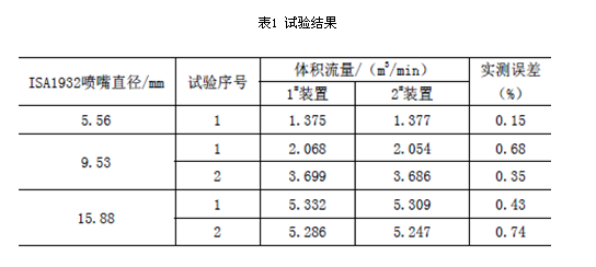 在進(jìn)行兩套ISA1932噴嘴測量裝置(1#裝置與2#裝置)之間對比時,分別對直徑為5.56mm、9.53mm和15.88mm的噴嘴進(jìn)行試驗(yàn)。試驗(yàn)結(jié)果見表1。