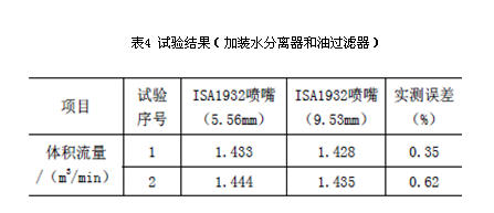 通過試驗(yàn)結(jié)果可以發(fā)現(xiàn)ISA1932噴嘴測量裝置在使用直徑為9.53和15.88mm噴嘴與ASME噴嘴測量裝置在測量結(jié)果上保持一致,偏差均小于1%。而ISA1932噴嘴測量裝置在使用直徑5.56mm的噴嘴時,誤差很大,且是偏大方向。分析原因可能由于5.56mm的ISA1932噴嘴直徑太小,氣體中存在的水滴或油滴吸附在噴嘴上,導(dǎo)致噴嘴壓差增大,測量結(jié)果偏大。于是在測量裝置前加裝了水分離器和油過濾器,再次將兩個ISA1932噴嘴測量裝置串聯(lián),并將直徑為5.56mm和9.53mm的噴嘴分別安裝在位于兩個測量裝置中進(jìn)行試驗(yàn),且交換位置后再次進(jìn)行試驗(yàn)。試驗(yàn)結(jié)果見表4。