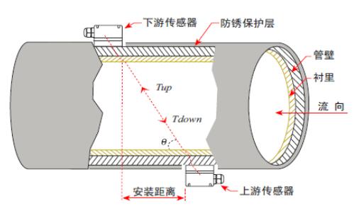 時(shí)差法:利用聲波在流體中順流傳播和逆流傳播的時(shí)間差與流體流速成正比這一原理來測(cè)量流體流量的。原理如下圖所示:
