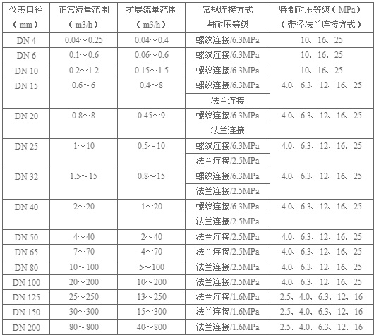 | 儀表口徑(mm)及連接方式 | 4、6、10、15、20、25、32、40采用螺紋連接 |