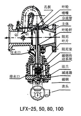 被測(cè)蒸汽流經(jīng)流量計(jì)本體:時(shí)由孔板節(jié)流,在前后壓差的作用下,一部分蒸汽通過(guò)噴嘴進(jìn)入分流管噴嘴形成的射流推動(dòng)轉(zhuǎn)子軸以上端的翼輪旋轉(zhuǎn),轉(zhuǎn)子軸下端有兩阻尼葉片在注滿阻尼液的阻尼室中作阻尼轉(zhuǎn)動(dòng),使翼輪能充分吸收射流的動(dòng)能。翼輪的旋轉(zhuǎn)力矩與阻尼力矩相平衡時(shí),翼輪的轉(zhuǎn)速與流經(jīng)流量計(jì)被測(cè)蒸汽的質(zhì)量流量成正比,通過(guò)修正,分度,由指示器表盤反映出累積蒸汽的實(shí)際流量。